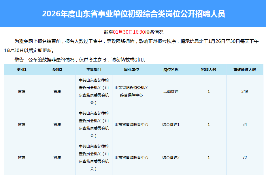 2026山东省事业单位初级综合类岗位公开招聘报名情况(截至1月30日16:30)